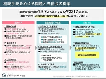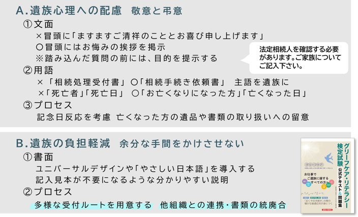 相続や死亡時の手続きなど、遺族と接する全ての業務設計に、機能要件として「グリーフケア」を要求して頂けたらと考えています。