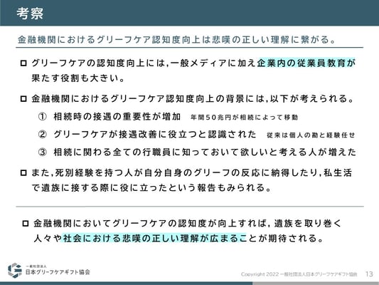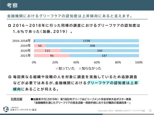 毎回異なる組織や役職の人を対象に調査を実施しているため追跡調査などが必要ではあるが,金融機関におけるグリーフケアの認知度は上昇傾向にあることが伺える。