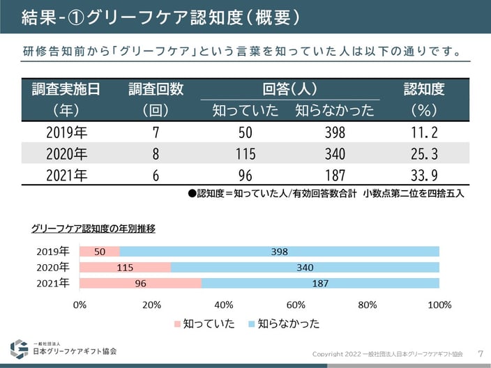 【調査結果】2019年は7回の調査を行い,有効回答数は448人,2020年は8回の調査で455人,2021年は6回283人です。有効回答数全体に対して「グリーフケアを知っていた」と答えた人の割合ー認知度ーは,2019年は11.2%,2020年は25.3%,2021年は33.9%でした。